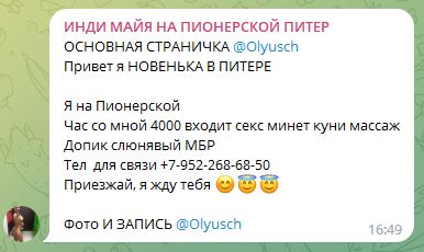 Доброго времени суток!) Удалось побывать недавно в гостях у одной девчины по имени Майя, которую случайно отыскал в ТГ, @Olyusch (группа t.me/znakomstva_spb_78). По фото очень заинтересовала...пару дней поразмышлял и решил посетить. Списались, договорились, приехал на Пионерскую. Находится по адресу Ипподромный пер. 1. Адрес, телефон и фото указаны в ее профиле в ТГ (@Olyusch). В группе было рекламное объявление (фото ниже), а в нем собственно и был указан ее профиль. В рекламном объявлении фото с лицом, а в профиле нет. После встречи с ней предположу что фото с лицом похоже но не ее, возможно типаж. ТТХ ее ни каких не указано, кроме того, что грудь 3 размера. По впечатлениям: