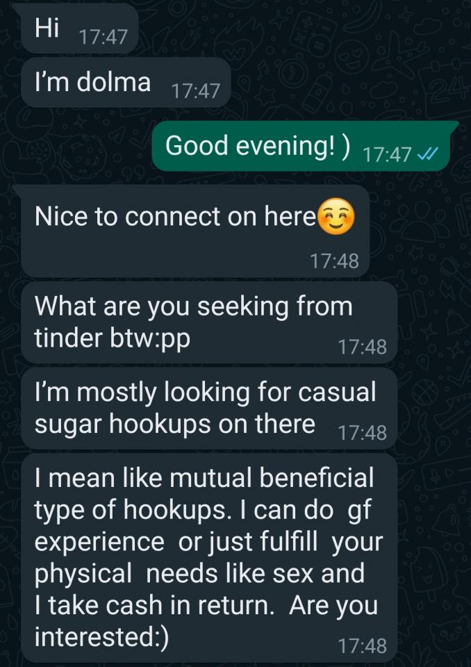 По прибытии в страну я зашел в Тиндер чтоб переставить поиск на местную локацию. И в течении дня на меня вышла первая, она же и единственная, дева. Сразу предложила перейти в вотсапп, где и сообщила, что предлагает как услуги эскорта (в смысле составления компании для похода куда либо) для состоятельных гостей столицы, так и просто физический контакт исходя из почасовой оплаты.