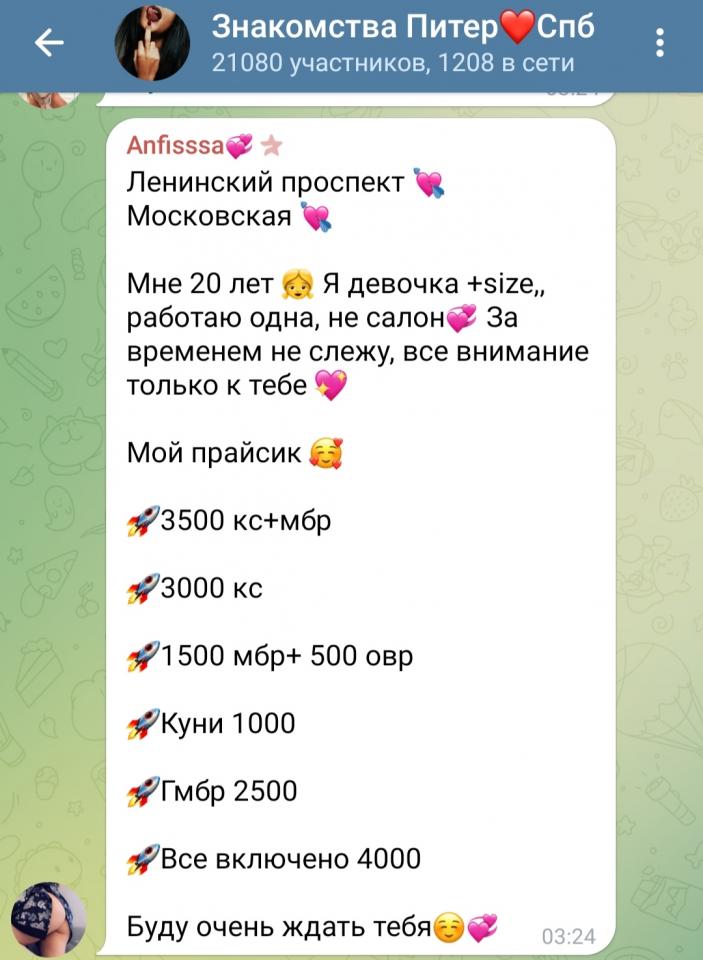 Побывал у этой девушки недели 3 назад, до этого долго переписывался, часто меняет локацию. Принимала она на Пулковской улице рядом с метро Звёздная , наводит четко. Фотки не передают реальное положение дел, дева крупная и маленького роста. По процессу: всегда пытается угодить клиенту, клиентоориентированность на высоте, сосет отлично, ей самой видимо нравится , трахаться с ней одно удовольствие, так распологает к себе и ведёт себя как будто она твоя девушка. Из минусов это конечно лишний вес, она сама стесняется этого и не снимает халат прикрывает живот
