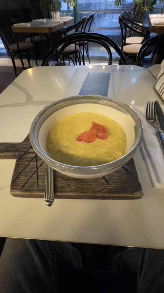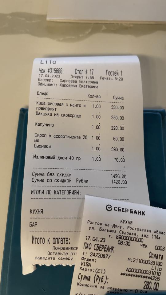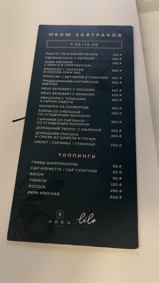 Завтракал в ресторане при отеле, название не запомнил) Меню чисто под завтрак, за исключением алкашки. Цены Питерские) Брал рисовую кашу с грейпфрутом и яичницу с томатами, капучино. Плюс в дорогу взял сырники. Всё очень съедобно, заточил всё)) Сам ресторан красивый, есть и диваны и просто стулья к столикам.При оплате по карте подвисает терминал) Поел на 1420р)