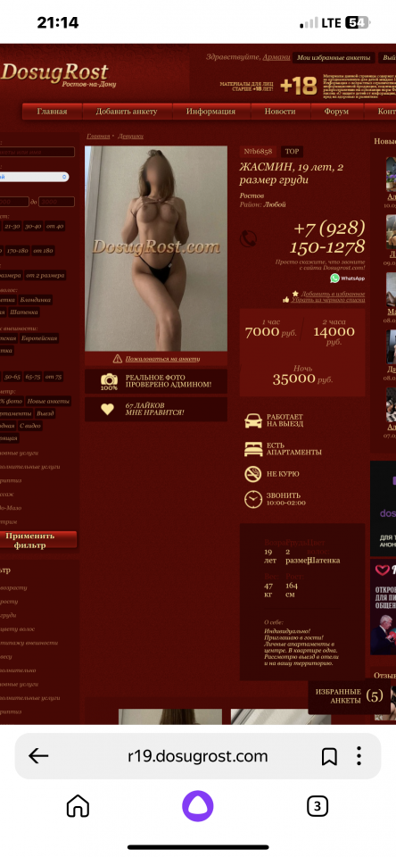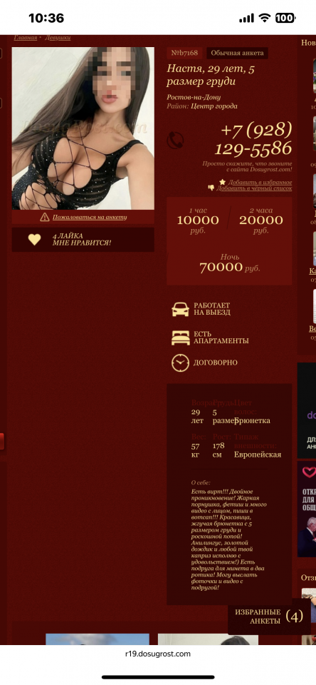 Настя, 938-878-28-14 - просит предоплату в половину стоимости от часа. Прежняя анкета удалена, там была Блонди с 4/29/172/54-8.000/час. Сейчас новая анкета с номером 928-129-55-86 и уже 10.000/час и немного другими параметрами. Отвечает только на звонки, переписку не ведёт