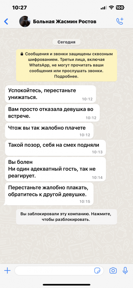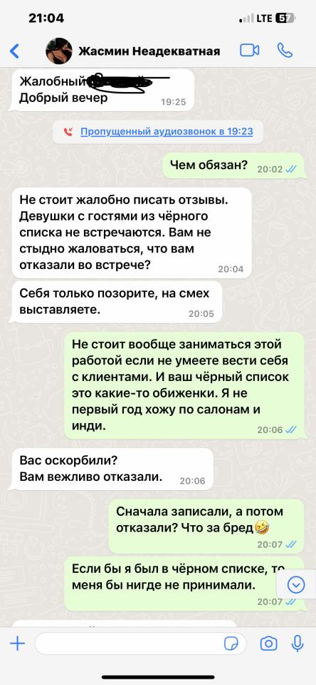 Ещё один номер Неадекватной Жасмин) Всё не успокоится второй день, хотя я даже не отвечаю, просто сразу блочу 928-150-12-78