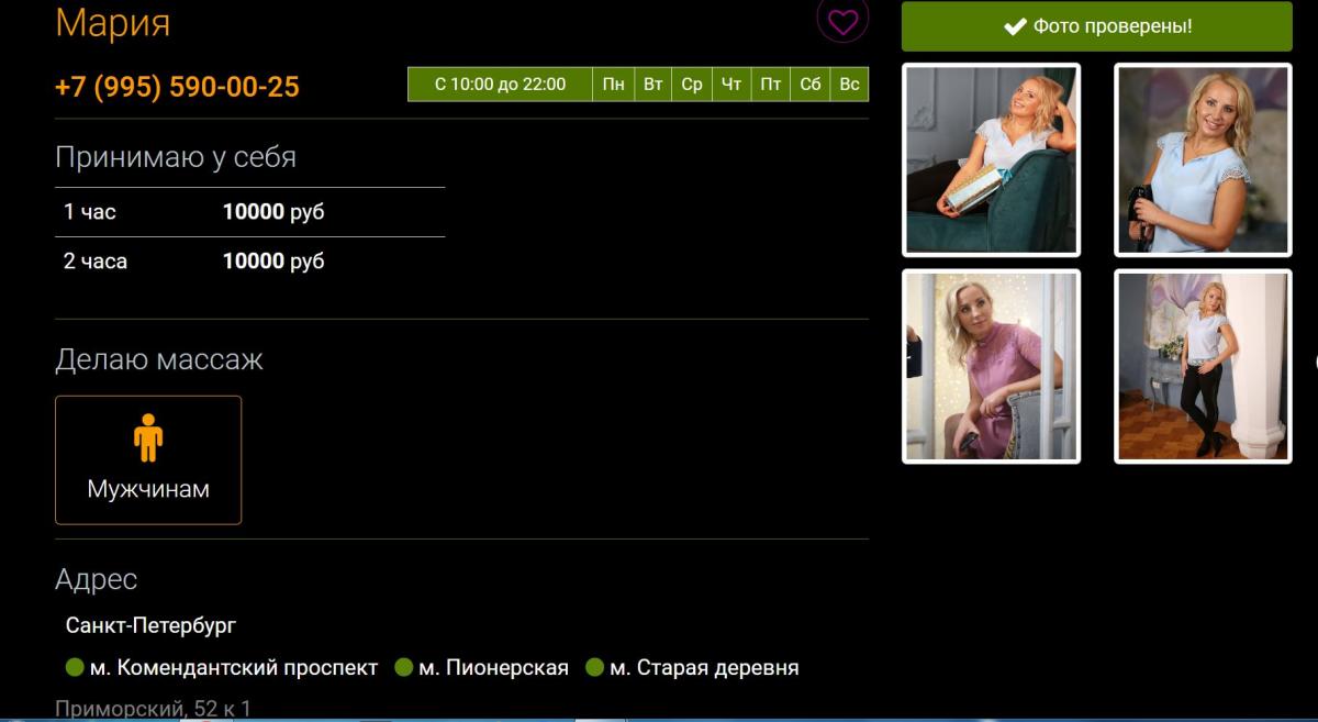 Принимает в однокомнатной квартире на Приморском 52 корпус 1, в новом доме. Квартира скорее всего съемная, следов пребывания ребенка в ней не просматривается. Этот район мне хорошо известен, в прошлом году я полтора месяца (!!!) потратил на окучивание другой безинтимной массажистки, принимавшей рядом, на Приморском 50 Б...