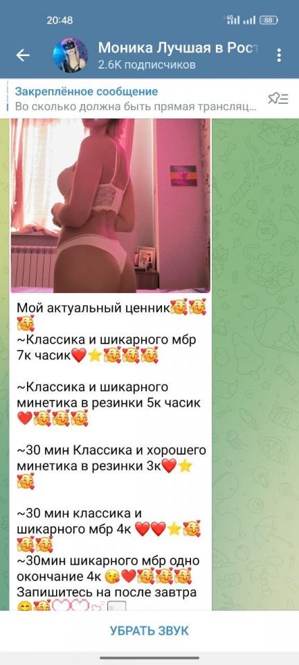 Посетил девушку. Нашёл на одном из тематических сайтов по Ростову. Там в описании была та же телега, в ней ссылка на канал. Списались за день, попал в свободное окошко. Принимает теперь на Герасименко 17/1. Студия рабочая, живёт в другом месте. По ттх: возраст около 30, не более. Грудь 2-2.5, сделанная. Рост 166, вес 45-50 максимум. Низенькая и лёгкая. Фотки в канале +/- актуальные и соответствуют реальности. Лицо в сравнении со старыми фото из отчётов стало похуже. По процессу поддержу предыдущих товарищей, всё супер. Ценник 8р - КС, МВР, куни. За 1к доп МБР. В целом по Ростову ценник ниже среднего, а учитывая крокодилов в объявлениях по 10р+ то грех жаловаться. Один из немногих удачных походов. Чуть не забыл, у девы ограничение по возрасту-28+. Чуть было не развернула когда узнала что я младше. Как-то так.