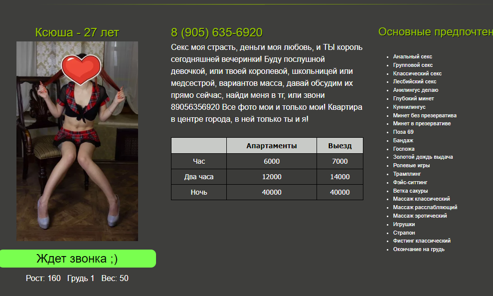 Меня не приняла. Позвонил, спросила знаю ли я расценки, сказал да. Сообщила адрес. Через 10 минут перезванивает и говорит - я не готова вас принять. Захожу в Telegram, а там известный бот мне сообщает, что по моим данным (номер телефона) был произведен запрос. Вот и думайте. Номер основной, ему лет десять, ни в каких нумбах про него ничего не написано. Ну и фиг с ней.