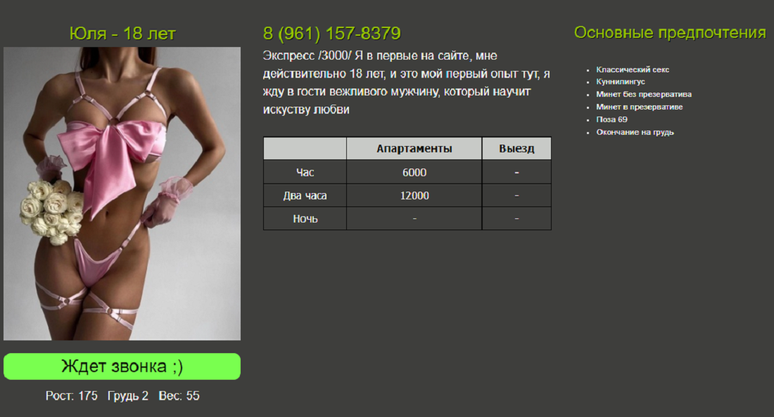 Юля - 18 лет, 961-157-83-79 , https://berry.intim76.com/girls/5728 По телефону как будто общается сама, голос был похожий молодой. Адрес Богдановича 11. Возраст соответствует, наверно не больше 20. На фото не она, но очень симпатичная , скромная, молодая девушка. Длинные, тёмно-коричневые волосы. Встретила в обтягивающем платьице ( как потом понял одетом на голое тело ). Квартира двушка, бардака нет, ванна, полотенце, моющие средства есть, в норме. В другой комнате точно есть напарница, не видел , но не особо и тихарилась. Так что не инди , а заезжий шалманчик. Был на экспрессе 3000 , допов не брал. После помывки в комнату пришёл, она не уходила , не гасилась. Платье сняла, и голая вся, не белья не чулков. Фигура понравилась, хорошая , молодая. Всё в меру и не худая и не толстая, косяков не заметил, грудь двойка стоячая с острыми сосками. Как в анкете и написано ,девушка начинающая, не опытная. С обрезиниванием проблема, минет слабенький на пол шишки. Не умеет но старается. КС обычный , узко, брито, смазка магазинная, со сменой позиций, трогать, гладить не воспрещается. Супер секса конечно нет и ждать не чего, в анкете и написано, что не опытная. Короче мне понравилось, очень редко (особенно у нас) проходят такие реально молодые и симпатичные, пусть и без опыта, не всё же ушлых чпокать.