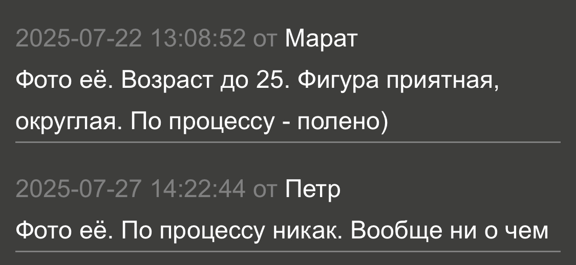 Процесс вообще не зацепил: минет монотонный, механический, секс, как с брёвнышком, в голову лез анекдот: "ебу и плачу..." Полное отсутствие сексуальной энергии.