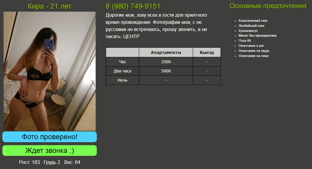 Кира - Мира тел. : 980-749-91-51 , 928-242-28-58 Обе анкеты её: https://girls.intim76.com/girls/5144 , https://girls.intim76.com/girls/5145