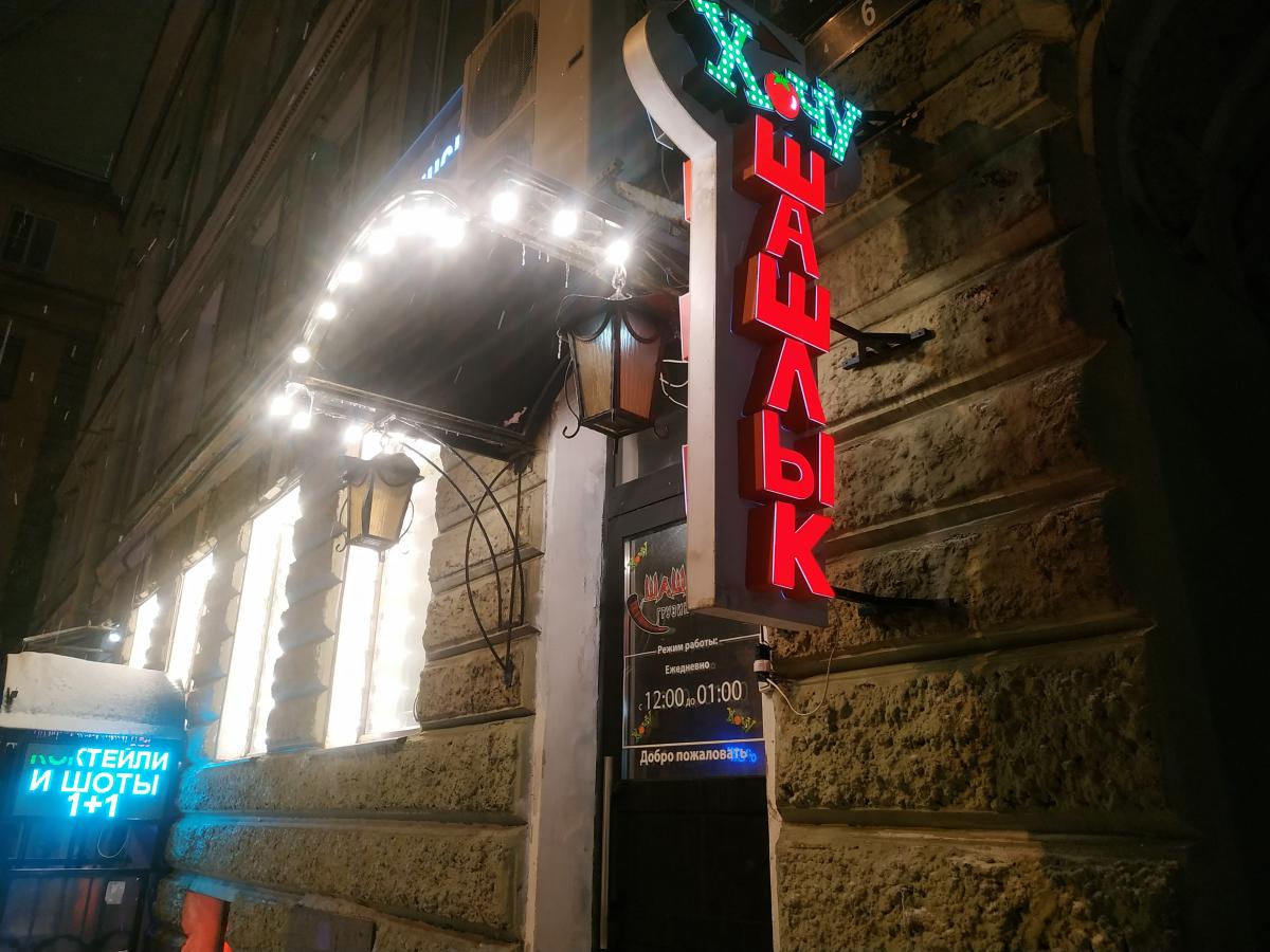 Встречались на Сенной с Agemo. Запланированное место прямо у площади под названием "Хачапури тётушки Марико" оказалось калом: убогие столики впритык, мангала нет, шашлыков нет (это в грузинской то едальне!) Свалили оттуда очень быстро. В Гинзу в этот раз не пошли. Нашли поблизости данную шашлычную. Два зала, в будний день начала вечера почти никого, музыки не играло. По обстановке - типичная грузинская забегаловка. Как Агемыч выразился - смахивает на придорожную закусочную для дальнобоев.