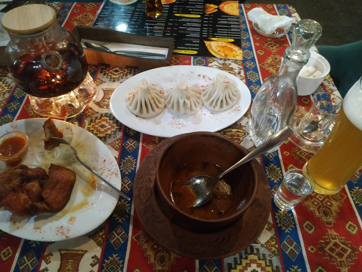 Коллега алкашку не пил, ну а я уж немного откушал водочки Хортицы (200мл/600р) + 3 светлого (750р) + харчо (390р) и 3 хинкали (444р)