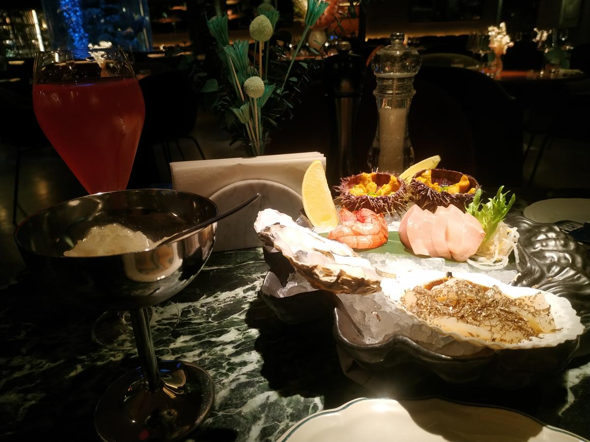 2) Плато "Signorina" (6500р) - морские ежи и сотоварищи. На блюде в виде ракушки со льдом : 2 ежа, 2 устрицы, гребешки, сашими тунца 5 кусочков, 2 сашими-креветки. Всё свежее, вкусное. В ежей добавляют перепелиный желток, креветки хотелось бы покрупнее. К плато приносят три соуса, один из которых их фирменный табаско. - не впечатлил.
