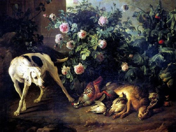 «Натюрморт с собакой и битой дичью у розового куста». Автор: Депорт Франсуа.