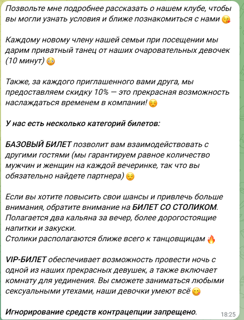 И под конец выскажу сугубо ЧАСТНОЕ мнение .Знаете на что это похоже ? Пару-тройку лет назад были такие стрип-бары в подвальчиках куда народ прямо с улицы затаскивали симпатичные девицы , после чего разводили вошедших на напитки по 20-кратной стоимости (а потом кто даже докреативил до того ,чтобы в напитки что-то подмешивать и полностью опустошать карты попавших на удочку клиентов). Так вот , а тут может быть такая фишка : владельцы вот такого стрип-бара где-нибудь в подвале в центре решили сделать ход конем : обозвать себя элитным свинг-клубом и под этой вывеской искать себе клиентов .А по сути это смесь стрип-бара с консумацией и борделя . Поэтому и для женщин вход дорогой .Но бордель запрещен ,а свингклуб - организация легальная,хоть и в серой зоне.А деньги безналом для того ,чтобы все было под контролем хозяев .Повторюсь ,это сугубо МОИ догадки после прочтения переписки в начале этой темы