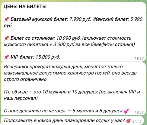 Вообще, хотелось бы комментов ai-37 , спеца по свинг туссам. Хотя, мне тоже кажется, что ценник 15 к за анлимитед время с одной из обслуживающих работниц, какой то наеб, во времена когда час в интим бизе уже стоит такую сумму. В чем заинтересованность именно работницы, а не участницы, кроме денег в таких мероприятиях?