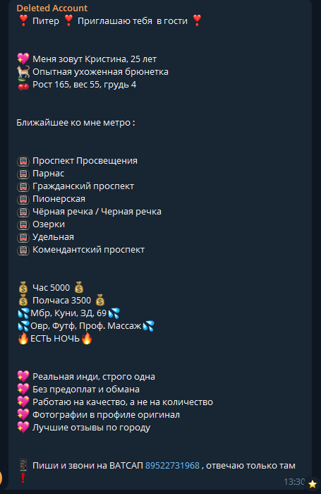 Рекламируется в ТГ, выцепил в группе "Индивидуалки Спб"