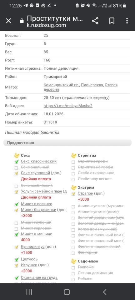 В анкете стоит зеленая галка на поцелуях, спросил про это, сказала не целуется, а галку просто не убрать, огорчился я. По фото видно что есть небольшой живот, но она его прекрывает нарядами, грудь большая как и положено. Любителям подобного формата зайдет очень даже. Попа огонь, это хотелось отметить особенно.