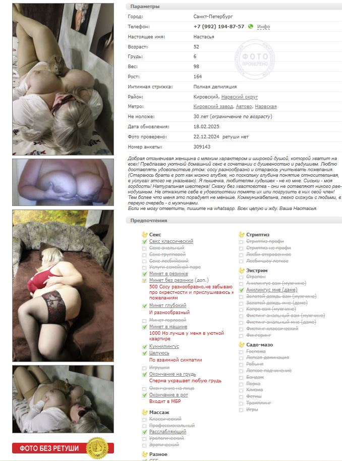 Дама сосать любит и умеет, другое востребовано не было. Общается через Ватсап, быстро отвечает, похоже, без диспа. Сразу интересуется возрастом, с молодёжью неработает. Любит поболтать.