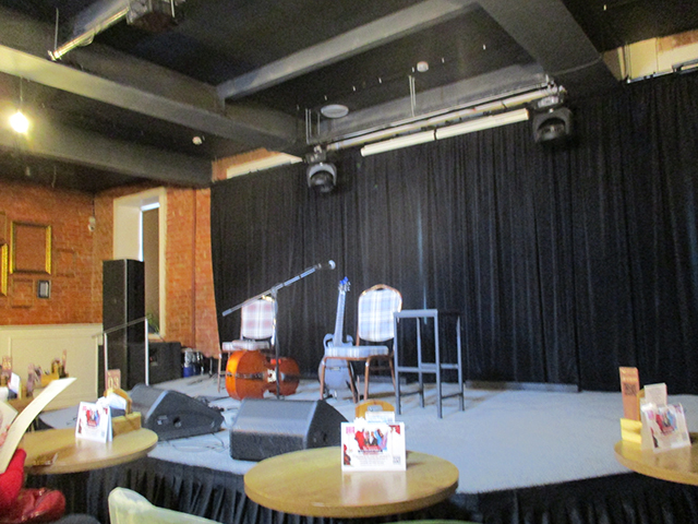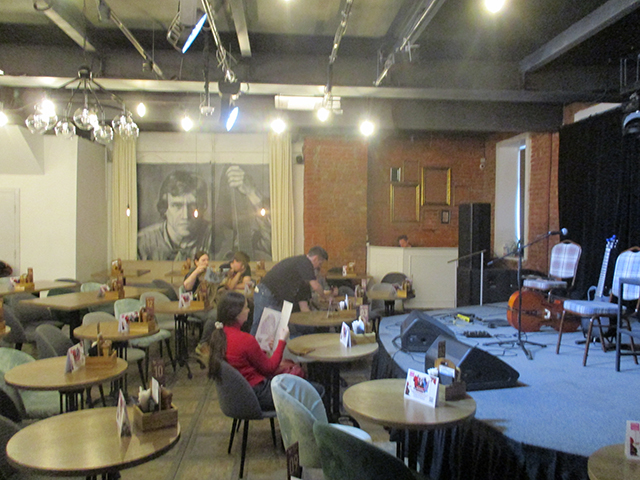Зал примерно на 100 мест, все места сидячие за столиками. Оно и неудивительно – нахрена на бардовских концертах танцпол?