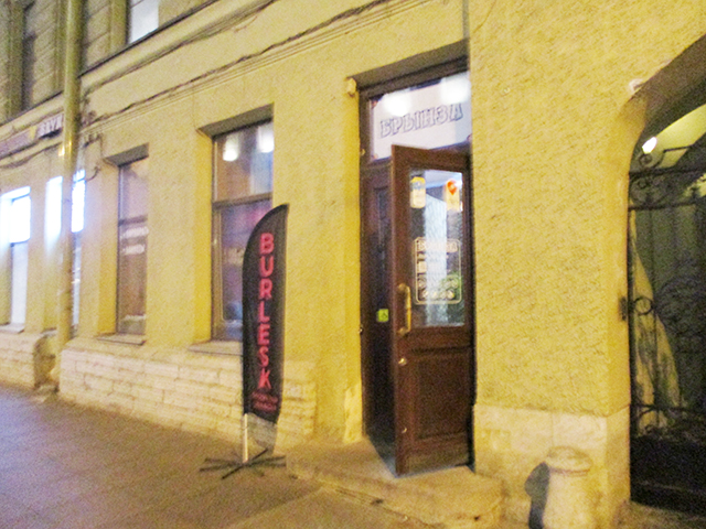 Проходя мимо, можно вообще не заметить, т.к. над дверью вывеска какого-то кафе "Брынза", от Бурлеска только не сильно заметный флажок слева от входа.