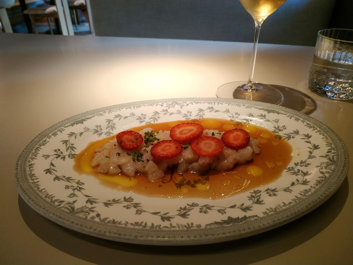 1) Тартар из гребешка и лангустинов (1350р) - подаётся в соусе на основе мёда и японской мяты шисо, сверху порезали ломтями клубнику. Отменное сочетание! Нестандартно и вкусно.