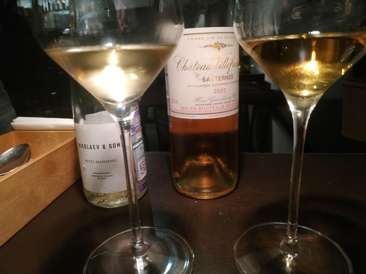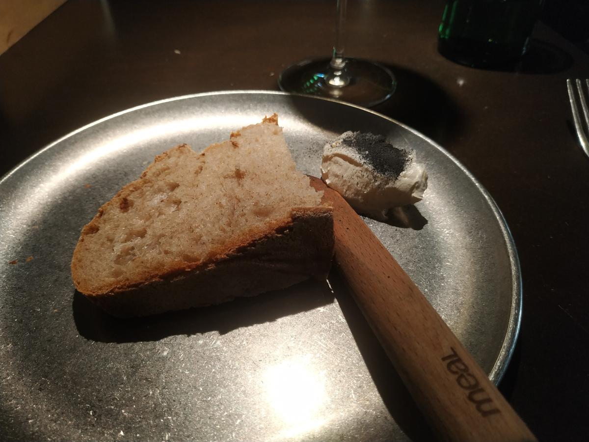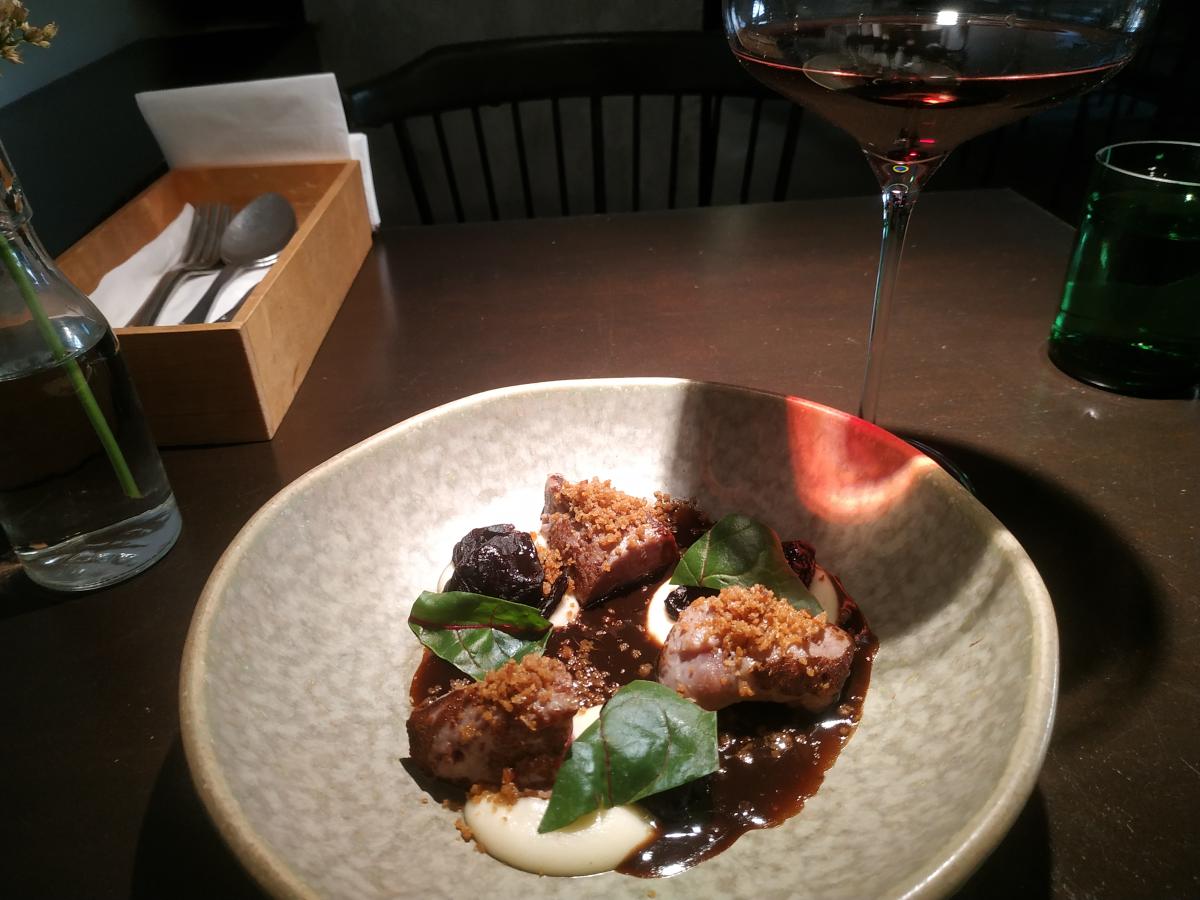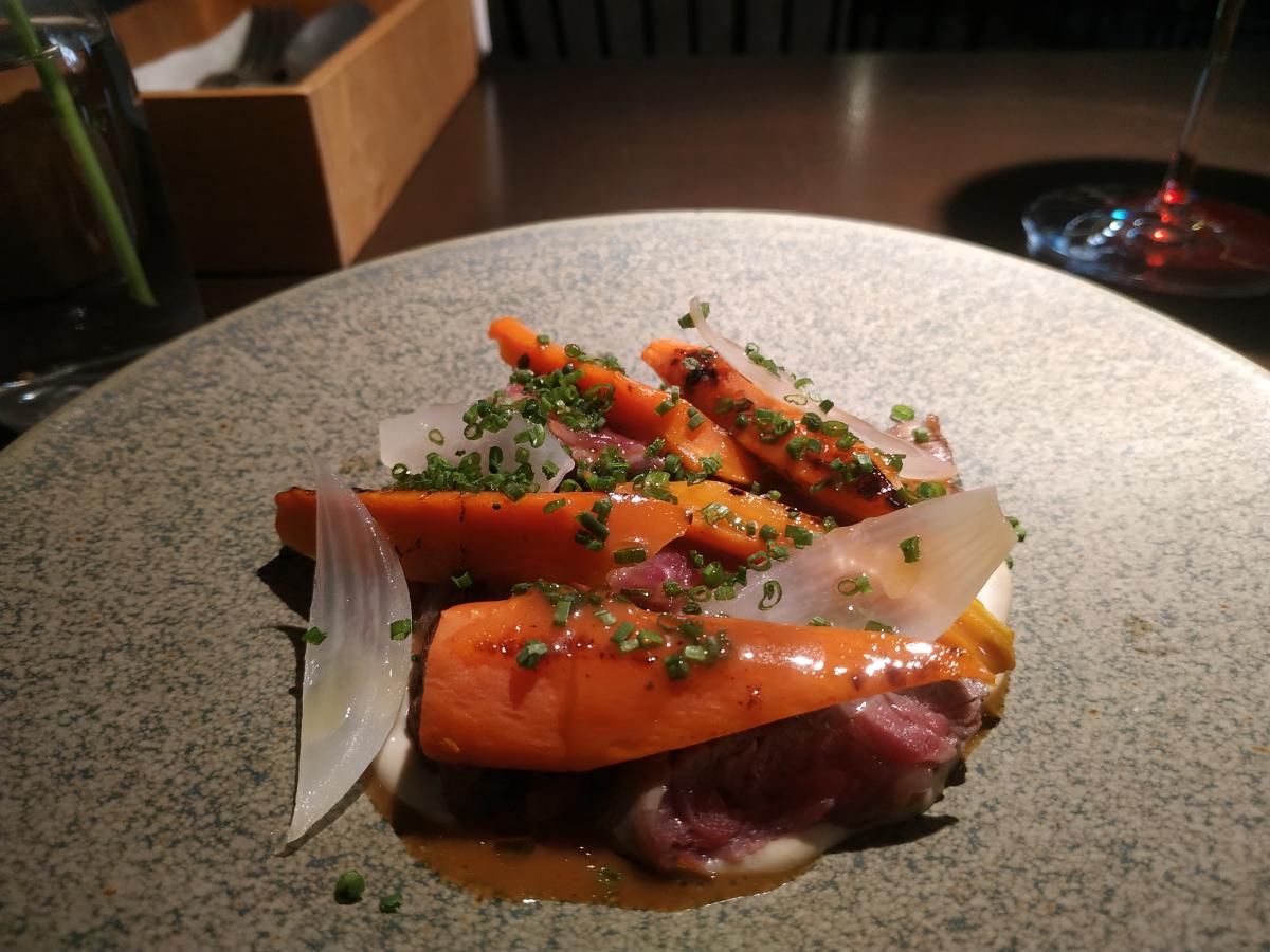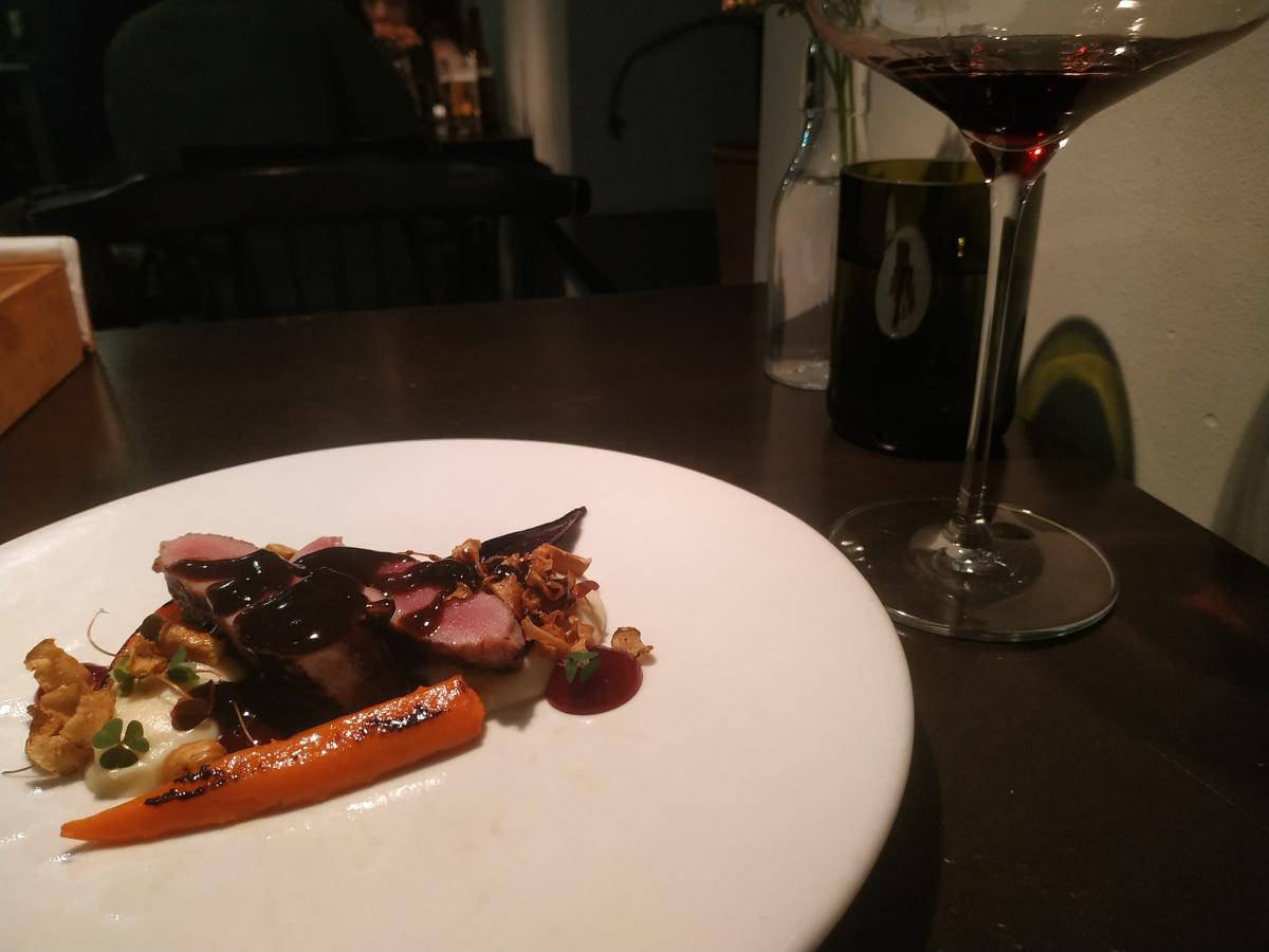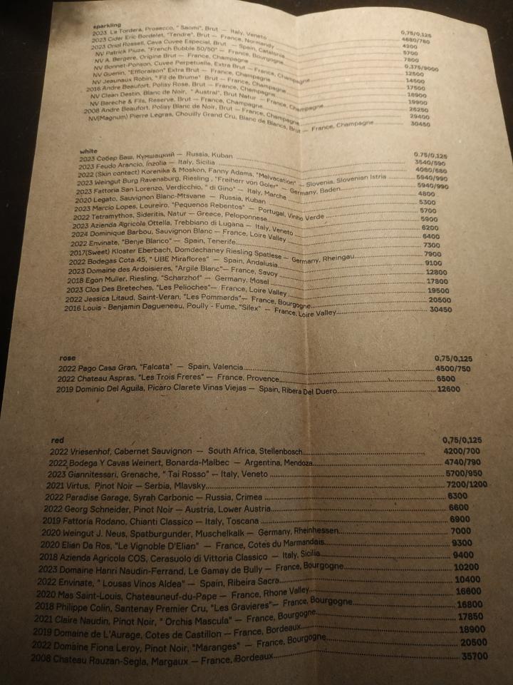Пожалуй лучшее что есть в кабаке. Отличная утка, нежная, сочная утиная грудка, ферментированная в рисе. Сперва вакуумированный рис лежит неделю, превращаясь в кашу, а затем в эту кашу суют утку на неделю. Далее утку обжаривают. Идёт с пастернаком, вяленой морковкой, гелевыми каплями из квашенной клюквы. Соус из "чернёного" чеснока, солода, коньяка и ЧЁРНОГО ХРЕНА! Винишко наливают отменное, тоже понравилось. Vitrus "Pinot Noir" 2021. Сербское, красное сухое, бархатное винишко.