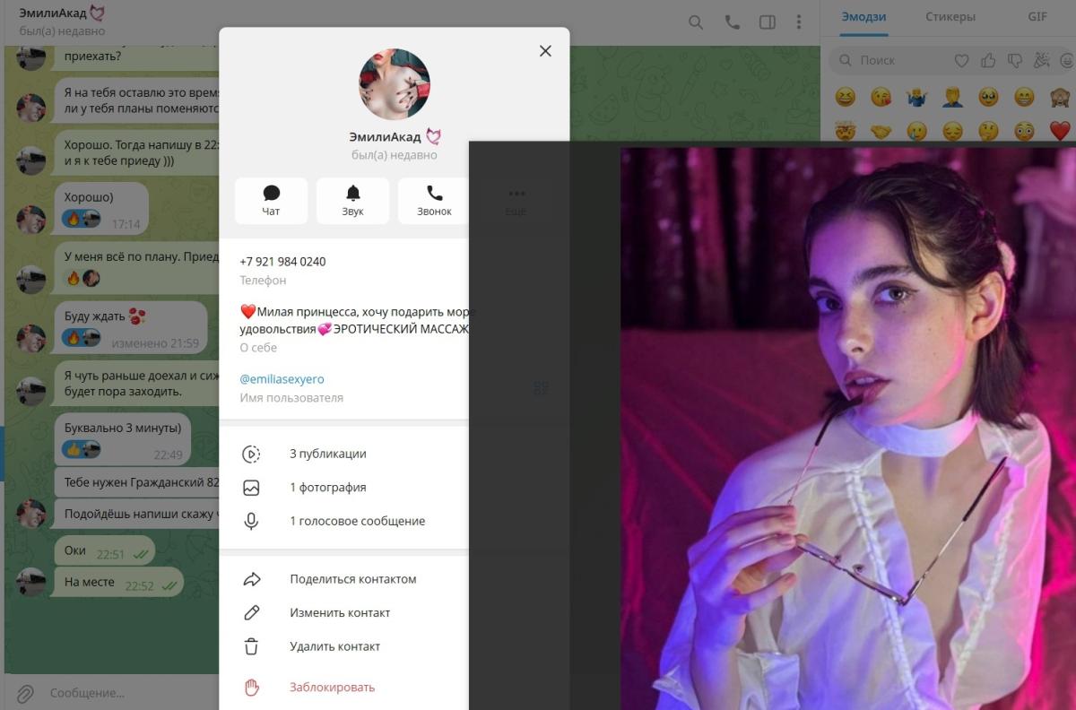 Фото. К сожалению, у меня какая-то фигня сейчас с РД, не могу открыть его с компа, потому выкладываю фото из РМ, а также сканы из её ТГ (там прямо в аккаунте написано, чем она занимается). Если говорить о внешности, то я не пожалел, что на них повёлся. Эмилия – реально яркая девчонка с интересным образом. Меня она встретила в тех самых очках с последнего фото (в переписке я её указал, что мне нравится этот образ).