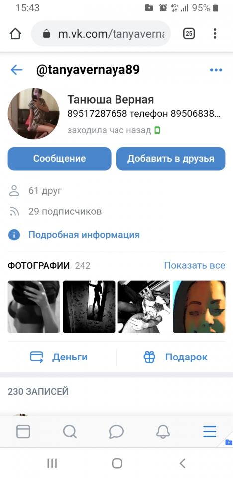 Танюша Верная https://vk.com/tanyavernayaвосемь9-как и писали выше с ебанцой, но если подойти опять таки с душой то получите качественны трах с прогибами, стонами и как мне кажется не отыгранными оргазмами. Но ебанца конечно сильная.