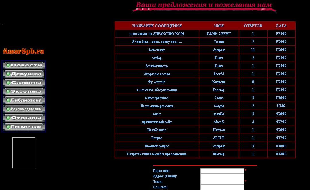 amurbase.com - лучший форум о сексе. На страницах нашего форума о любви Вы найдете все самое интересное об отношениях между мужчиной и женщиной. Также для вас всегда свежие отчеты и отзывы о проститутках Санкт-Петербурга: индивидуалках и интим-салонах Питера. На нашем форуме всегда много свежих секс историй и рассказов от активных пользователей. Наши участники всегда подскажут, где можно заняться сексом в Санкт-Петербурге. Если Вы хотите секса, но не знаете, где, с кем, и как, читайте https://amurbase.com/ - лучший секс форум рунета!