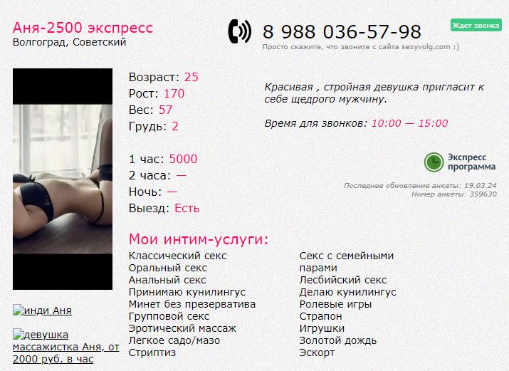 инди все отдыхали, а ездить на разведку к новым чето не было ни времени, не желания. Смотрю, на сайте засветилась всем небезизвестная Ксюха, она же Оксана 2часа 7500, она же КсюшаРаботаю. Вставлять ссылку не имеет смысла, все её и так кому надо знают, да и тем более она сейчас в архиве. Звоню, трубку взяла, алё-малё...договорились на определённое время, всё в том же небезизвестном Мартоне. Так как я у этой мадам уже бывал не раз, правда последний визит по-моему был в конце прошлого лета, ничего не предвещало беды, но оказалось я слегка ошибся)))) Подъезжаю к назначенному времени звоню, она говорит заходи я жду тебя в фойе. Захожу, Ксюша сидит на диване мило улыбается)) Вроде всё таже Ксюша, симпатичное личико, нарядное платице до колен, туфельки на каблучках, вообщем Ксюша как Ксюша. Садись говорит рядышком, мне кое что сказать тебе нужно, есть не большой ньюанс, я забыла тебе по телефону сказать, но у меня это вроде в анкете указано, я думала что ты в курсе, я немножечко в положении))) тебя это не смутит?! Зашебись информация, а главное вовремя!!!А немножечко это как?! До этого она сидела в позе что живота не было видно, да я и внимание на это сразу не обратил. А тут она отогнулась на спинку дивана и убрала руки, и тут я охерел. Вот это блядь немножечко, охуеть небольшой ньюанс))) Да ты насносях мать!!! И какой месяц? Восьмой..... Неее, я всё понимаю, есть люди которым нравится такое положение, есть кадры которые даже специально ищут таких проституток, и даже едут в другие города а иногда и страны за такой экзотикой, но я точно не из их числа))) Вообщем чу-чуть посидели, поржали над этой ситуацией, она извинялась что забыла предупредить, мол она забыла что беременна)))) Сказала что скоро, месяца через 3-4 вернется уже в былой форме, и пообещала волшебное обслуживанием за свою "забывчивость"))) и я, был таков. Но без женской ласки мне чёто в этот день не хотелось оставаться. Обзвонил ещё пару шалманов, но у меня чето не стал с ними клеится разговор. Решил пройтись по массажисткам, и мой взор сразу же упал вот на эту мадам: