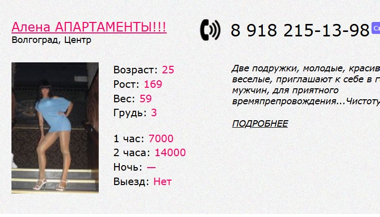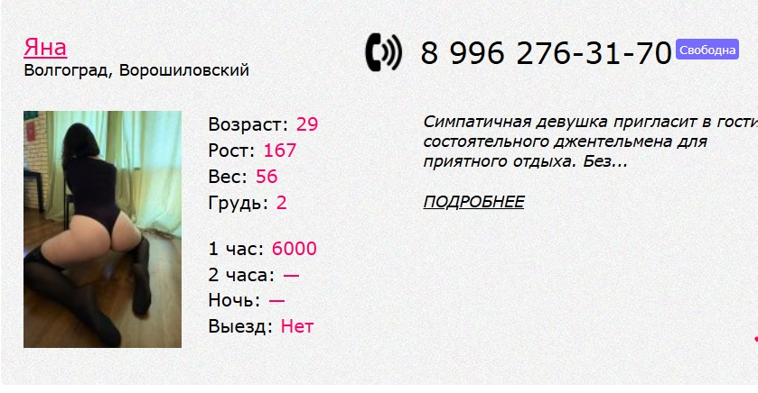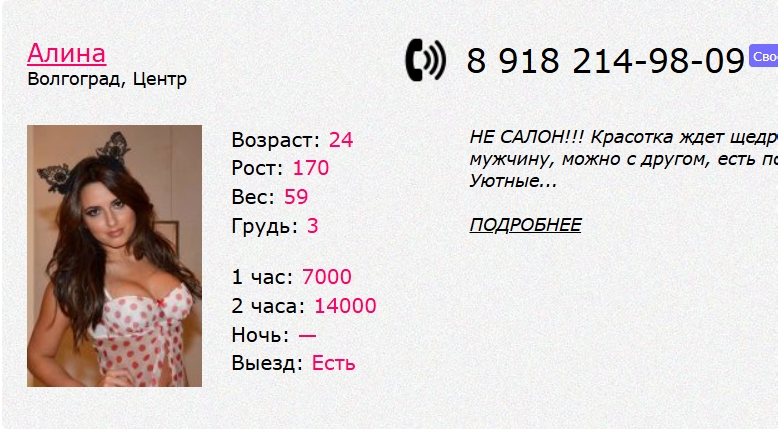 Тем временем нашел еще одну шлюху: https://sex0.sexvolg...utka/12025шесть и https://sex0.sexvolg...17608двенадцать (явно одна и та же, обратите внимание на параметры). С утра звоню по анкете Татьяна, отвечает неприветливый голос, но по звуку довольно молодой (в анкете матюр, напоминаю). Договорились встретиться в 17:00, контрольный созвон за час. Когда я уточнял стоимость услуг (назвала сумму 6000 за КС, МБР и куни) и примерные ориентиры на местности, отвечала довольно раздраженно (может, не выспалась или хз). В 16 часов звоню – не берет. Позвонил еще два раза с промежутками в 5 минут, то же самое, но прямо в ходе третьего звонка прилетает какой-то левый звонок (в Numbuster отображается как "Учетная запись удалена", номер нельзя посмотреть). Я понял, что это связано с феей, диспетчер или еще какая тварь. Спрашивает, что вы хотели? Говорю, классику, МБР и куни. В ответ: это будет 6500. Я: так утром же было 6000. Она: да? Я: да, до свидания и повесил трубку. Параллельно с этим разговором пришла SMS непонятно от кого с адресом "Кубанская, 17". Когда закончил разговор с неведомой зверушкоой, пришла вторая SMS, мол, на сайте указано классика 3,5, куни +1 и МБР +2. Я ответил "утром мне назвали сумму 6000" и закончил общение, но вдогонку всё-таки прилетела SMS "одно окончание". Ну и в пизду тебя, подумал я и пошел домой.
