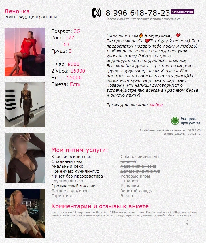 ЗКП. Опять активно двигается, насаживается, прогибается. Вот Энерджайзер! Засаживал на всю глубину и на разных скоростях. Не ныла, не торопила, честно отрабатывала с полной отдачей. Респект! Закончили в миссии. После чего лёг на кровать, она сразу же сняла презерватив и протёрла салфетками всё что надо, причём сделала это так быстро и профессионально, что я даже не понял, как это произошло, а она уже лежала рядом со мной и болтала обо всём на свете. Успела рассказать о себе практически всё, болтушка. Сказала, что в Волгограде первый раз. Так мило беседовали, что я опять возбудился. Даже возникла мысль продлиться, но налички с собой больше не было, а с переводами не хотел заморачиваться. Не хотелось расставаться, но я переборол себя и героически пошёл в душ). Ждала меня из душа завёрнутая в полотенце, весёлая, жизнерадостная и с улыбкой, попутно выдавая ещё кучу информации. На выходе ещё раз обнялись, поцеловались и распрощались. Всё категорически понравилось! Пробыл 36 минут. Походом доволен.