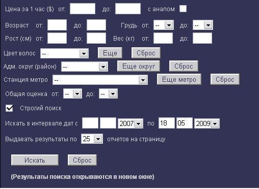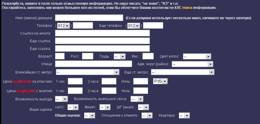 Суть затеи в том чтобы облегчить поиск как по телефону, метро, району, цене и т.д., а не для того чтобы заипать ходока. Чем усложняется жизть то, объясни...выбрать в предопределенной форме пару реквизитов да вписать еще пару? Ведь все что будет (Если будет) выбираться и вписываться и так тобою описывается, но в свободном полете, что практически сводит к 0 весь поиск акромя телефона. Куча народу еженедельно спрашивает в соответствующем разделе "Подскажите там то и там то, то-то и то-то" и причем вопросы дублируются поскольку через недельку, другой