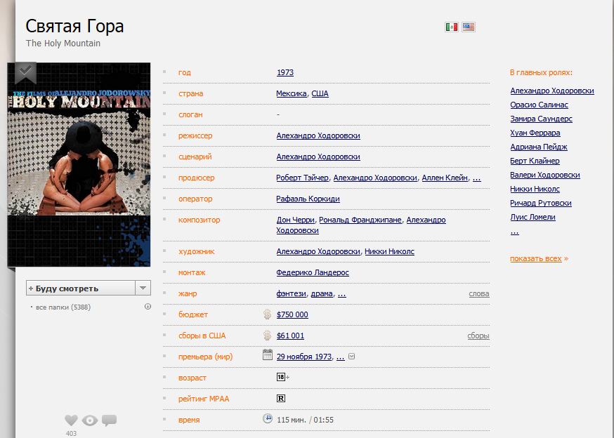 Культовый чилийский режик. Из 80-х .Поэтому, в этом фильме и набор хиппово-донхуановский. Есть более поздний, но не менее психоделичный фильм "Святая кровь". По уровню драматизма намного сильнее " Священной горы". Известен в эзотерических кругах. В 90-е практиковал в Париже гаданием по картам Торо. Знакомые записывались на прием - была очередь.