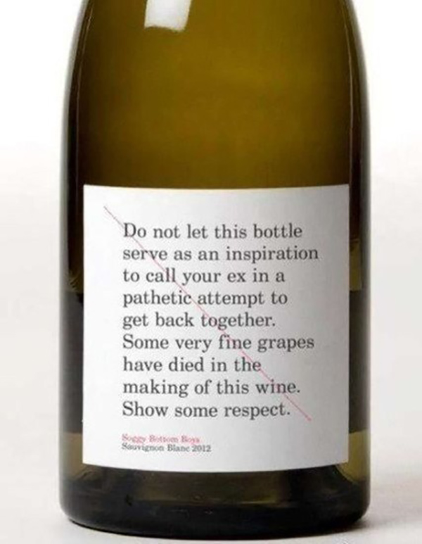 Не дайте этой бутылке стать причиной жалкой попытки вернуть вашу бывшую. Небольшое количество очень хорошего винограда погибло в процессе производства этого вина. Проявите хоть немного уважения.
