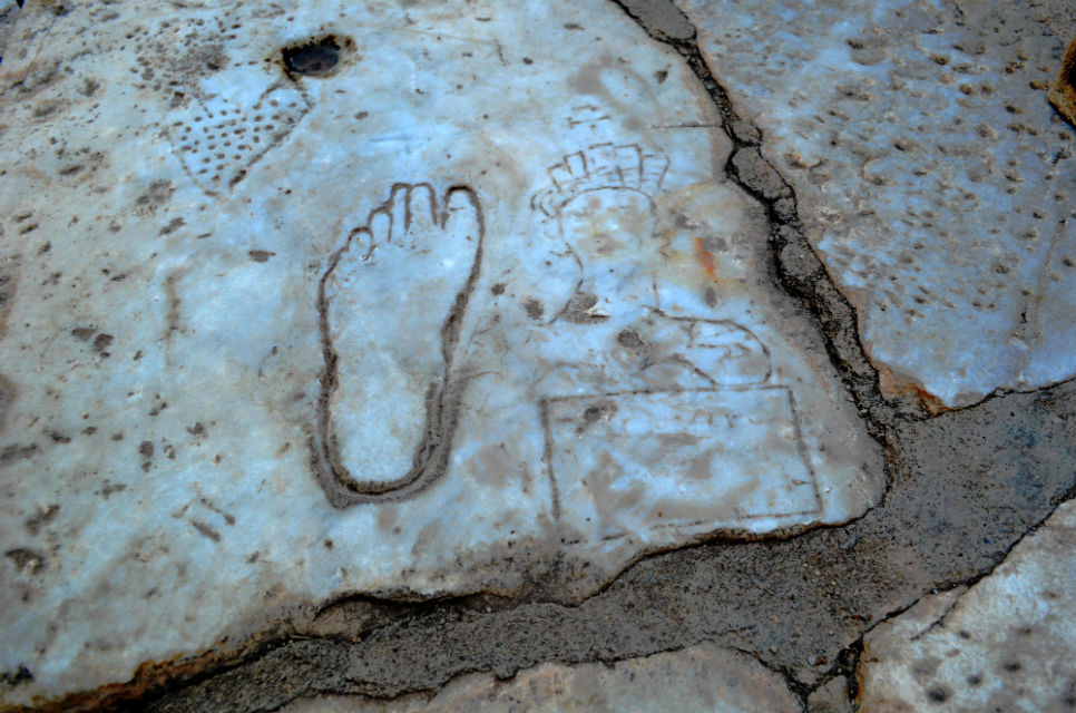 Расположение вырезанного в мраморе отпечатка ноги указывает направление борделя (House of Pleasure), женский бюст и сердце исчерпывающе презентуют суть услуг.