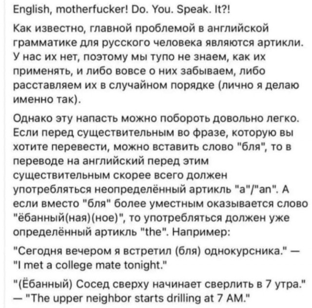"Прислали к нам сержанта из Москвы. Весьма интеллигентного юношу, сына писателя. Желая показаться завзятым вохровцем, он без конца матерился. Раз он прикрикнул на какого-то зека: — Ты что, ебнУлся?! (Именно так поставив ударение.) Зек реагировал основательно: — Гражданин сержант, вы не правы. Можно сказать — ебнулся, ебанулся и наебнулся. А ебнУлся — такого слова в русском литературном языке, уж извините, нет… Сержант получил урок русского языка."