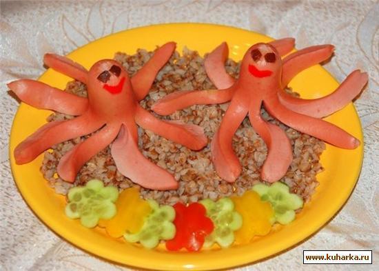 Вскипятить в кастрюле два стакана воды, медленно погрузить туда тушки осьминогов. Это нужно для того чтобы щупальца красиво завернулись.