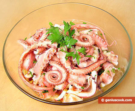 А можно еще вариант: не заправлять вареных осьминогов маслом и лимоном, а добавить других морепродуктов, вареные яйца (порезанные, ессно