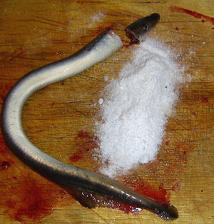 Живую (обязательно!) миногу умерщвляю обезглавливанием (что уж делать...один из нас должен был умереть) и протираю жменей крупной соли — от хвоста к...тому месту, где голова была...