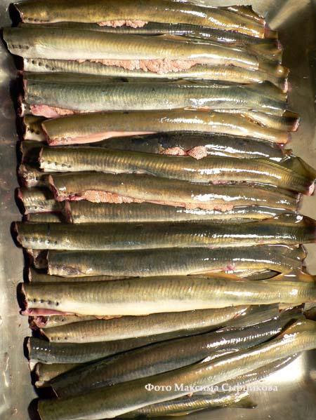 Таким образом — избавляюсь от большей части слизи и полостной крови.Далее — под струей воды надрезаю брюхо, обрезаю тоненькую кишочку и промываю полость. Подготовленные таким образом миноги промываются в холодной воде и слегка присыпанные солью — подсушиваются.