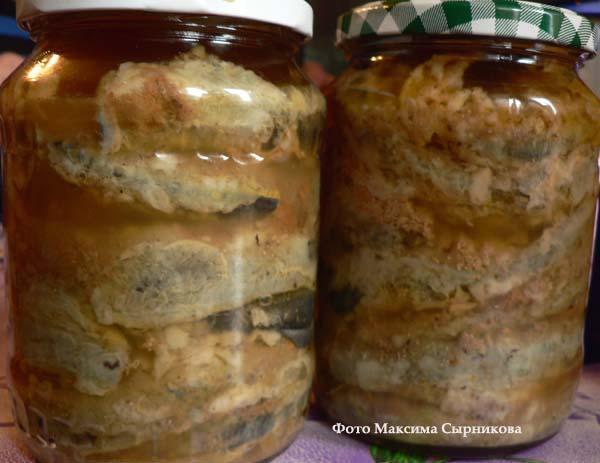 Все вместе это доводится до кипения и горячим — заливается в банку с заложенными не слишком плотно кусками миноги.