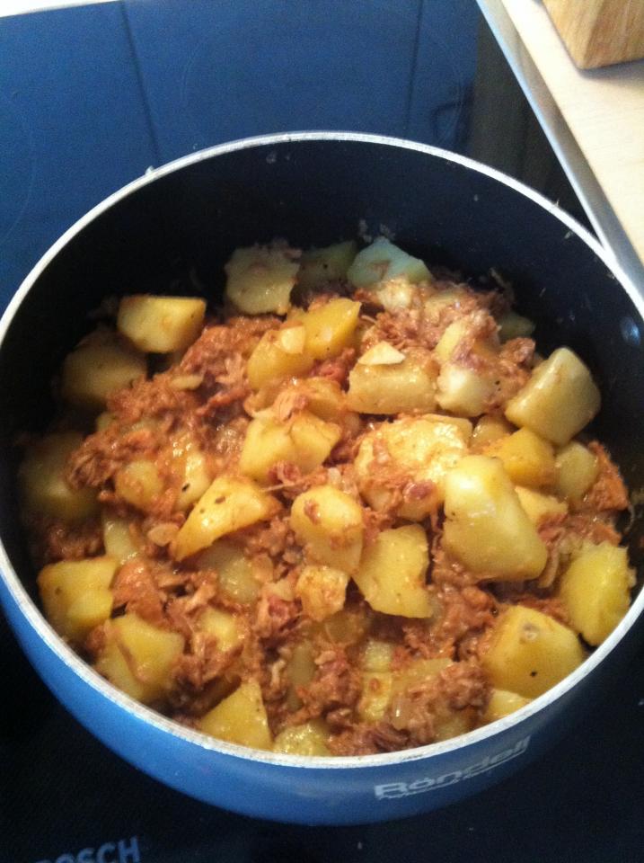 и потом в мясо вываливаю на 80% отваренные макароны (картошку) и тушу все вместе