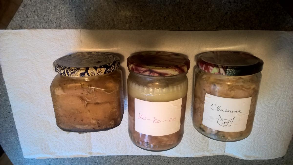 На фото слева на право: Тушёнка свиная из духовки (прямоугольная банка) хранится в холодильнике с мая прошлого года. Тушёнка из куриных бёдер хранится в холодильнике с марта этого года (готовилась в кипящей воде). Тушёнка из свинины хранится в холодильнике с апреля этого года (готовилась в кипящей воде).
