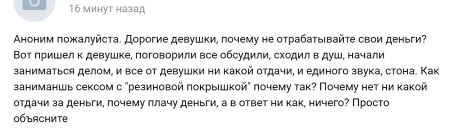 Доброго дня. Я поясню, чтобы было немного понятнее. У нас в НН дело даже не совсем в деньгах (ты прицелился на 5-10к). За эти деньги ты можешь найти девах, но прикол будет в том, что это будут те же самые девки, что и за 2-3к. Т.е. ты, коллега, тупо переплатишь за то же самое (и даже услуг более качественных за эту переплату не получишь). Поэтому дело не в деньгах.