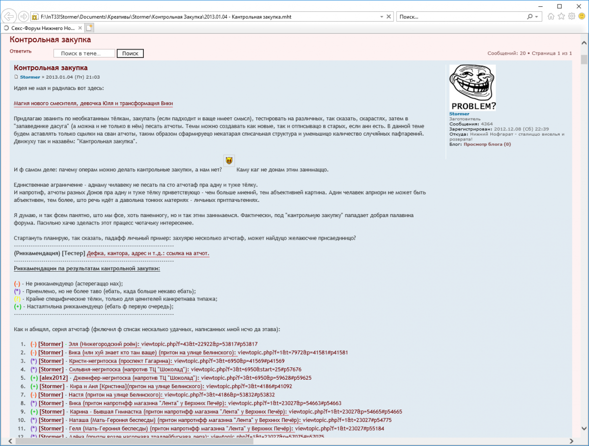 Иной раз читаю Ваши темы, и к концу теряю суть и содержание излагаемых здесь постов. Скорее всего тут настолько все запутанно и связано, что если не стоял у истоков данной службы (НижПалкоКонтроля), то всю цепочку событий понять сложновато.