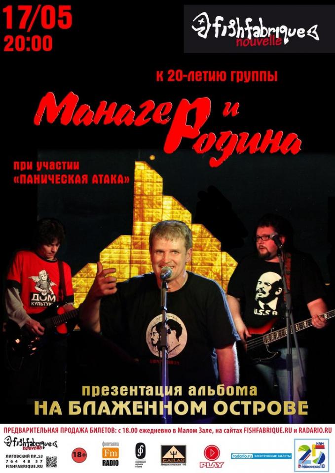 17 мая в Fish Fabrique Nouvelle (Лиговский 53) — Манагер и "Родина" (электричество), концерт-презентация нового альбома "На блаженном острове". Гости - группа "Паническая атака".
