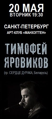 20 мая в "Манхэттене" - с акустическим концертом выступит лидер белорусской группы СЕРДЦЕ ДУРАКА Тимофей Яровиков.