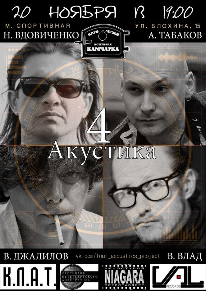 20 ноября в Камчатке - 4 Акустика - авторский проект Андрея Табакова (На Грани...), суть которого заключается в объединении четырёх авторов-исполнителей в одном мероприятии, где каждый автор в течении 45 минут играет песни в акустическом варианте.