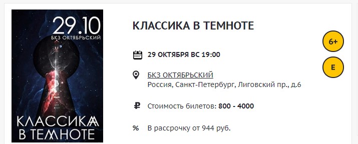 И вот, 29 октября «Виртуозы Петербурга» при участии солистов Михайловского театра выступят с обновлённой программой. Бах, Вивальди, Верди, Форе, Равель, Беллини, Пьяццола – избранные произведения великих композиторов будут звучать в темноте, в космическом пространстве, где светят только звёзды. Билеты – уже здесь, на spb.kassir.ru, и во всех офлайн-кассах «Кассир.ру» на улицах Санкт-Петербурга.
