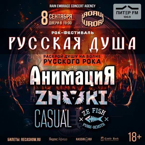 Что для вас Русский Рок? Тернистый путь борца за идеалы? Или может быть это свет звёзд, опаляющих наше воображение? Для нас это прежде всего Душа. Русская необъятная и абсолютно родная Душа. Осенним сентябрьским вечером Анимация, Знаки , Casual и Ze Fish раскроют это понятие в полной мере для всех, кто в этом нуждается или разделяет сей окрыляющий порыв. Пусть ничто нас не остановит!